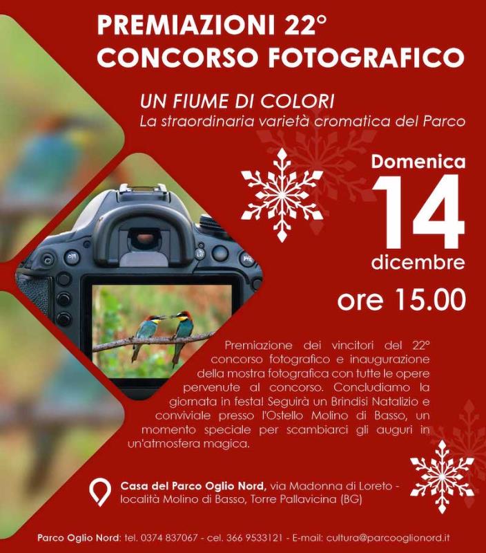 La premiazione del 22° concorso Fotografico e l'inaugurazione della mostra a tema: "Un Fiume di Colori. La straordinaria varietà cromatica del Parco" si terranno domenica 14 dicembre, alle ore 15.00, nella Casa del Parco Oglio Nord (per la premiazione) e nella Sala macina (per la mostra), in Via Madonna di Loreto - località Molino di Basso, Torre Pallavicina (BG).